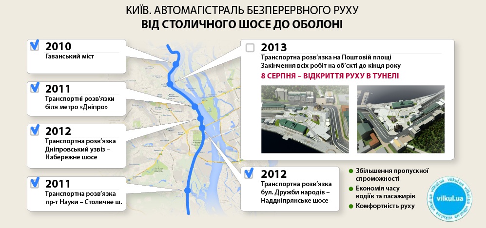 Ведется реконструкция 6-го объекта магистрали непрерывного движения - транспортной развязки на Почтовой площади в Подольском районе Киева, что увеличит пропускную способность этого узла с 85 до 110 тыс. автомобилей в сутки.