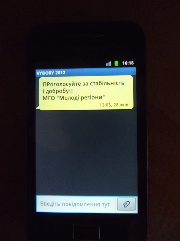 В воскресенье, 28 октября, от имени Всеукраинской молодежной общественной организации «Молодые регионы» в некоторых областях Украины на мобильные номера избирателей рассылались СМС-сообщения с призывом поддержать на выборах ПАРТИЮ РЕГИОНОВ.