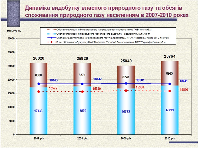 Для потреб населення щорічно необхідно 27,0 млрд.куб.м природного газу: 18 млрд.куб.м природного газу власного видобутку, який використовується, для приготування їжі, підігріву води, індивідуального опалення та 9 млрд.куб.м імпортованого природного газу, які реалізуються підприємствам комунальної теплоенергетики для виробництва та надання населенню послуг з опалення та гарячого водопостачання.
