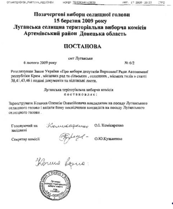 В настоящем постановлении Луганской ТВК, выданном Козачку на руки, нет слов о регистрации его как кандидата от Единого Центра (копия прилагается). Более того, во всех документах, поданных в ТВК Козачком А.А., он фигурирует как беспартийный.