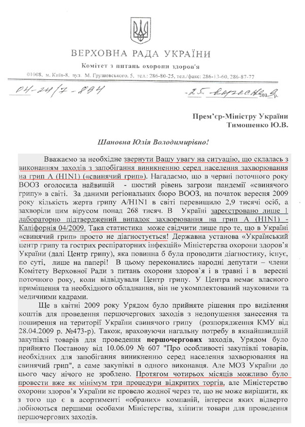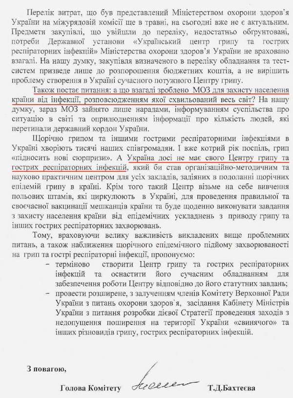 Вопрос готовности Украины справиться с эпидемией гриппа А/H1N1 был на постоянном контроле профильного Комитета Верховной Рады Украины. «Буквально месяц назад мы обратились к Премьер-министру Украины с требованием лично вникнуть в этот вопрос и принять соответствующие решения. К сожалению, многие из наших предостережений подтвердились, и на сегодня власть не готова в полной мере защитить своих граждан от этой чрезвычайной ситуации», - резюмировала депутат-регионал.