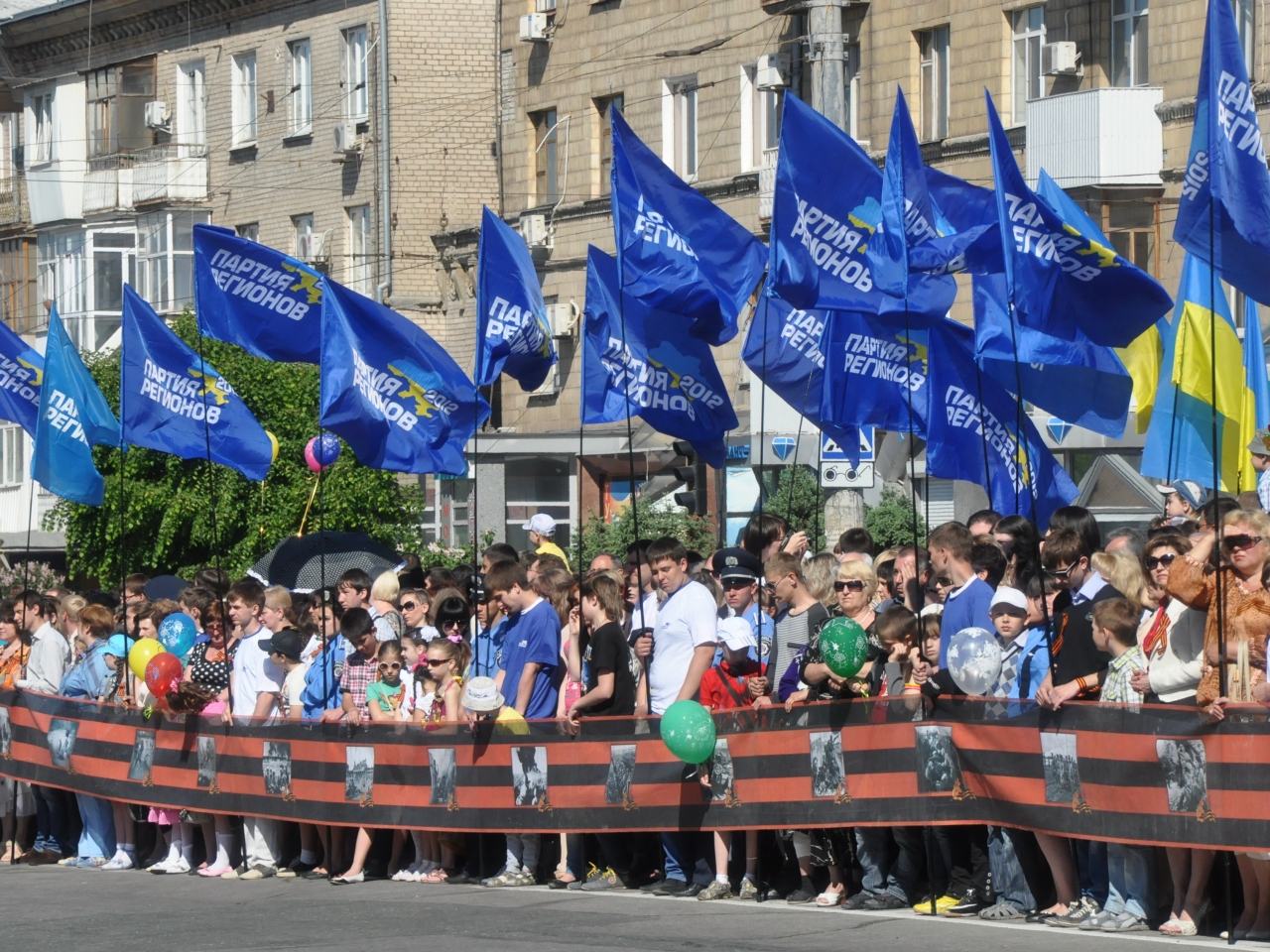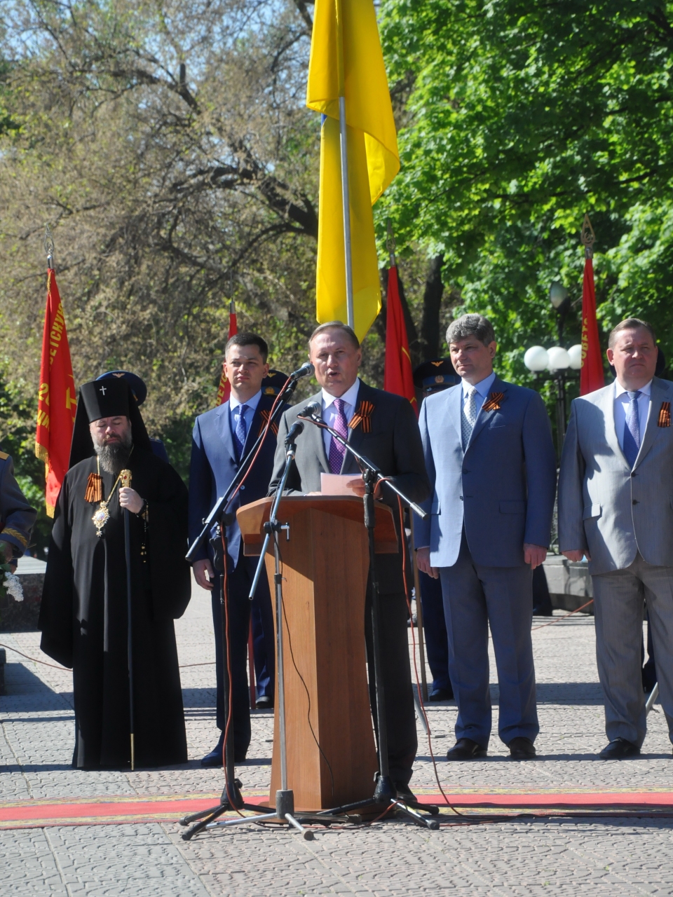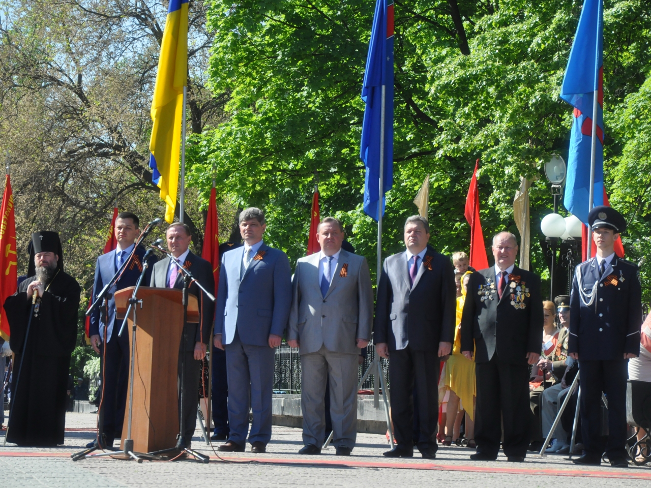…На площадь вносят боевые знамена прославленных воинских частей, защищавших Родину в годы войны. Начинается митинг. В нем принимают участие ветераны Великой Отечественной, народные депутаты Украины, члены парламентской фракции ПАРТИИ РЕГИОНОВ Александр Ефремов и Сергей Горохов, руководители области – председатель облгосадминистрации Владимир Пристюк и председатель облсовета Валерий Голенко, общественность города.