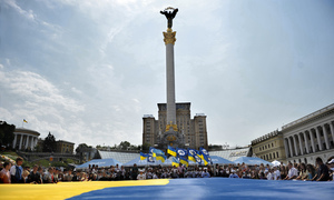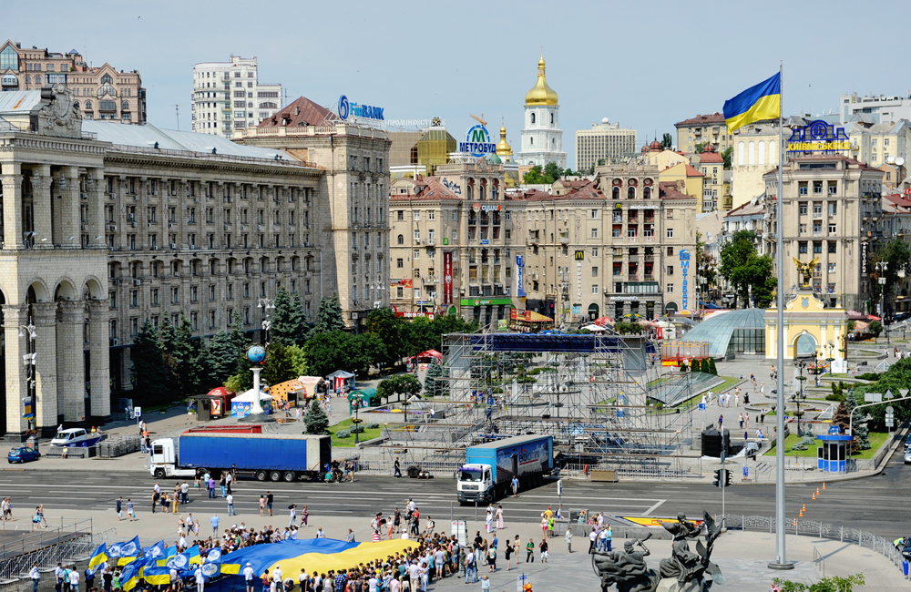 В 11:00 в самом центре столицы, на Майдане Незалежности, собралось более полутысячи молодых людей для того, чтобы вместе отметить один из главных праздников независимой Украины – День Конституции. Одним из главных атрибутов праздника стал самый большой в Украине Государственный Флаг, который участники флешмоба развернули у подножья монумента Независимости.