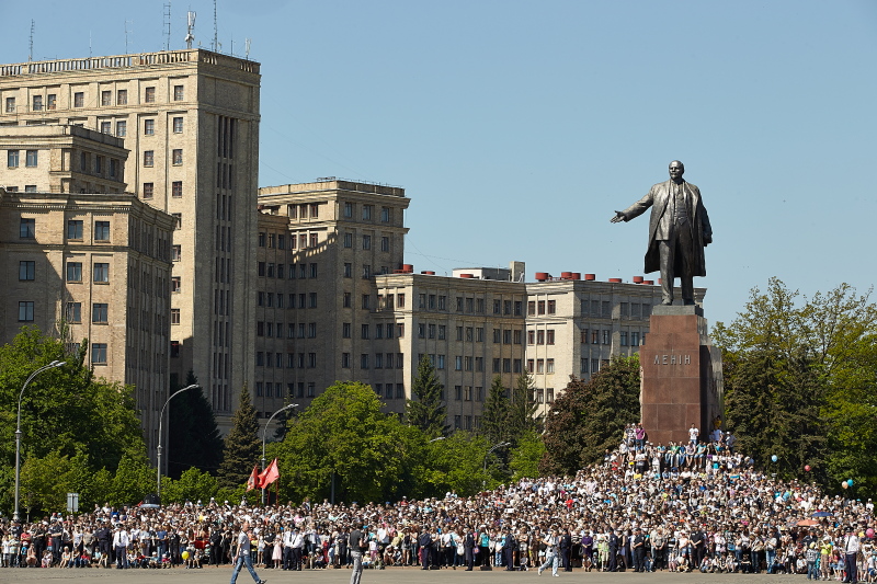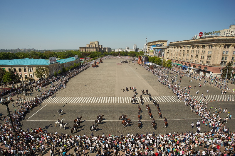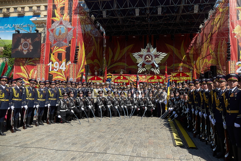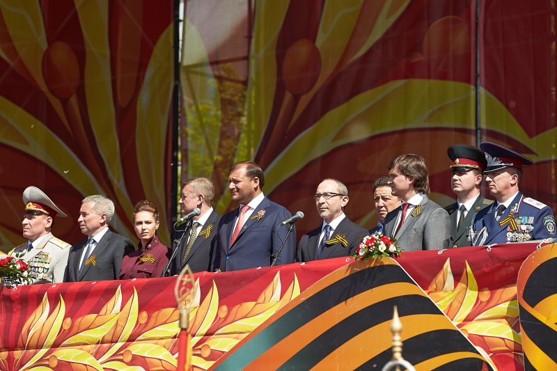 С трибун за выступлениями творческих коллективов и шествием войск наблюдали председатель Харьковской облгосадминистрации, председатель областной организации ПАРТИИ РЕГИОНОВ Михаил Добкин, председатель ХГО ПР, харьковский городской голова Геннадий Кернес, председатель Харьковского областного совета Сергей Чернов, народные депутаты Украины, члены парламентской фракции ПАРТИИ РЕГИОНОВ Ирина Бережная, Владимир Мисик и Валерий Писаренко, Герои Советского Союза Федор Пуртов и Михаил Карпеев, ветераны ВОВ.