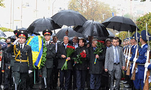 Николай Азаров поздравил ветеранов, приглашенных для участия в церемонии, и пообщался с ними. Премьер-министр Украины принял участие в возложении цветов к могиле Неизвестного солдата и чествовании памяти погибших Минутой молчания. После возложения цветов он принял участие в торжественном открытии памятных бюстов партизанским командирам Сидору Ковпаку и Алексею Федорову.