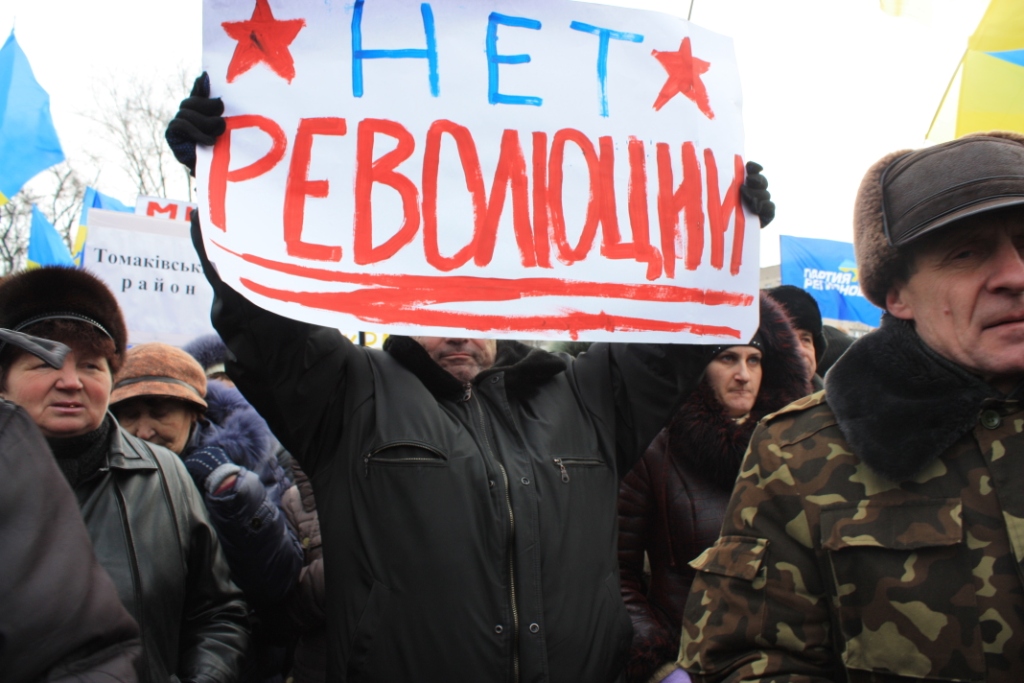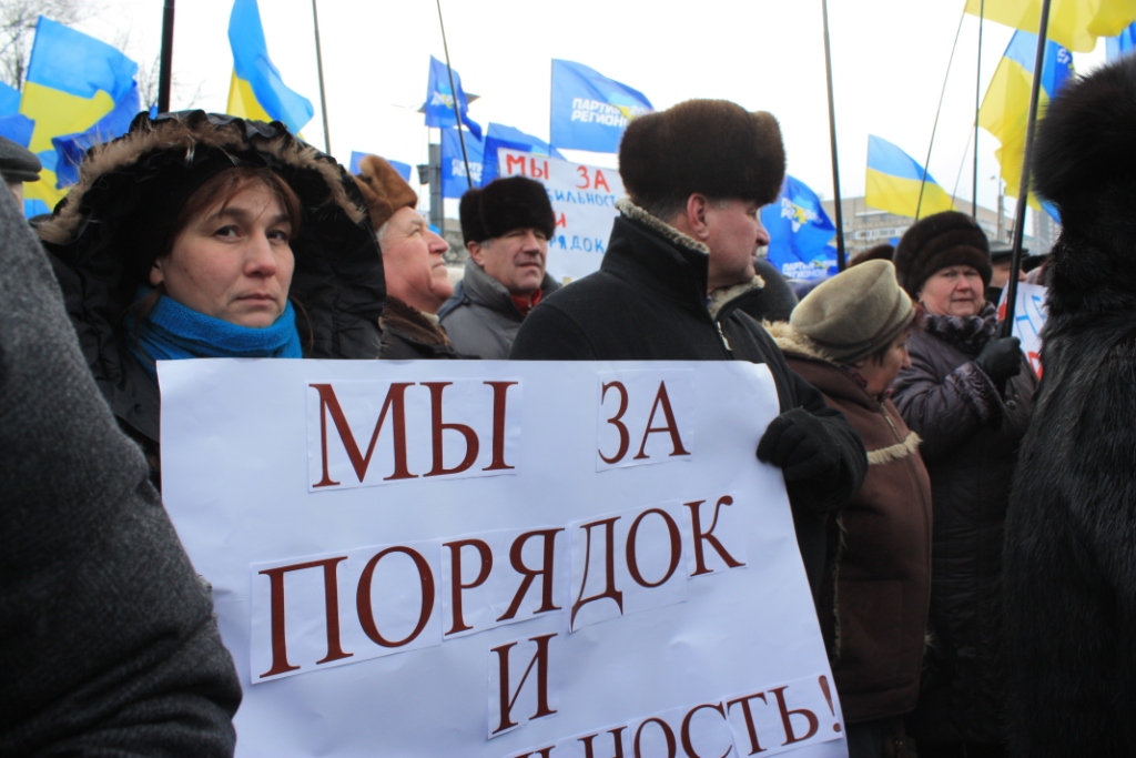 Жители Днепропетровщины собрались под лозунгами «Народ не только на майдане! Народ у станков и в забое!», «Мы за стабильность и порядок!», «Восток и Запад вместе!», «Не допустим государственного переворота! Сохраним Украину!», «Днепропетровск – за Януковича! Днепропетровск – за стабильность и порядок!», «Нет произволу и беззаконию!», «Майдан - не вся Украина!»