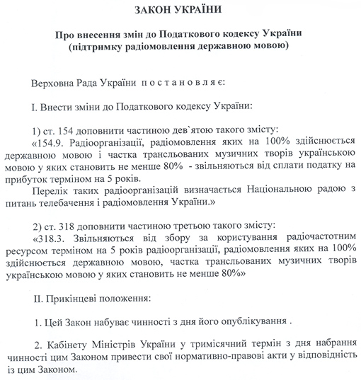 За словами депутата, відповідним законопроектом пропонується внести зміни до Податкового кодексу, за якими радіоорганізації, мовлення яких на 100% здійснюється державною мовою, і частка трансльованих музичних творів українською мовою у них становить не менше 80%, звільнятимуться від сплати податку на прибуток на 5 років.