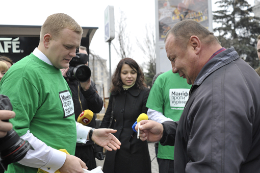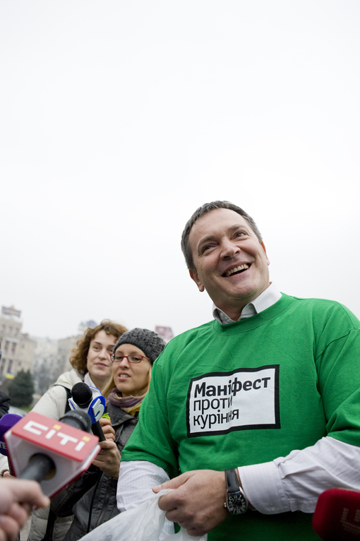 Андрій Пінчук, Вадим Колесніченко, Андрій Зац, Ірина Бережна, Віктор Корж, Ельбрус Тедеєв, Максим Луцький тридцятихвилинну перерву між засіданнями Верховної Ради провели на Майдані Незалежності, змінивши краватки та піджаки на футболки з надписом «Україна кидає курити».
