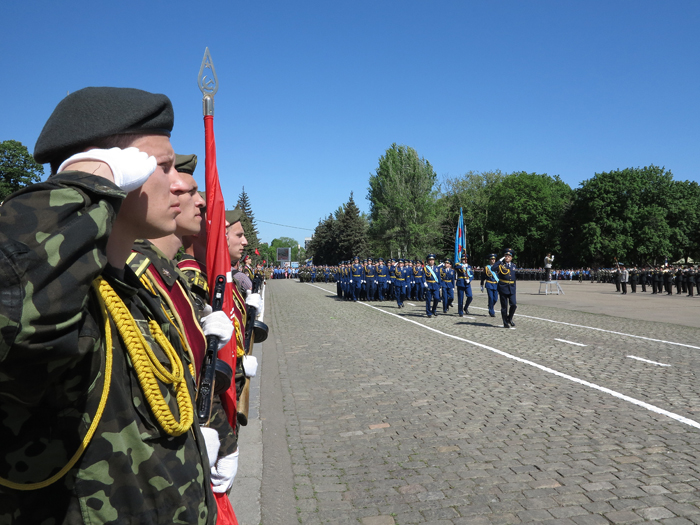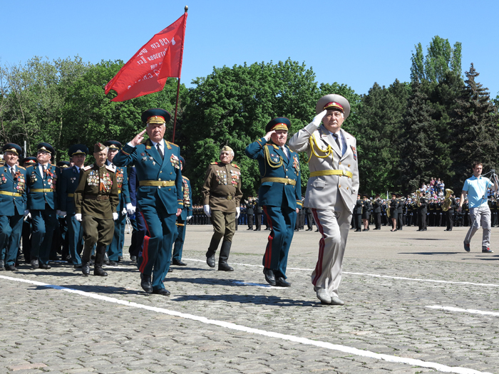 По традиции в начале парада по площади торжественно пронесли копию Знамени Победы 150-й стрелковой Идрицкой дивизии и знамена частей и соединений Красной Армии, которые в апреле 1944 года освобождали от немецко-фашистских захватчиков Одессу. Этой чести были удостоены курсанты Одесской военной академии.