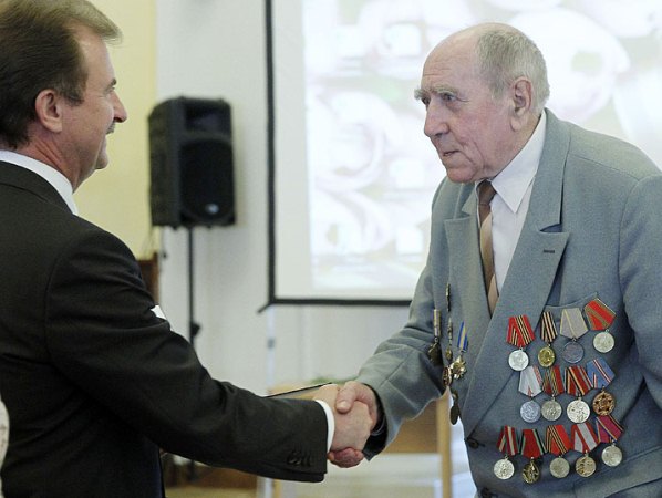 Александр Попов поздравил присутствующих с 68-й годовщиной Победы в Великой Отечественной войне и вручил Почетные грамоты Киевской городской государственной администрации и именные часы.