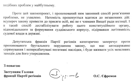 В связи с этой ситуацией заместитель главы фракции Партии регионов Александр Ефремов написал письмо Председателю Верховной Рады Украины Владимиру Литвину, в котором говорится, что депутатская фракция Партии регионов категорически против нарушения действующего законодательства и будет использовать все возможные средства для предотвращения таких попыток.
