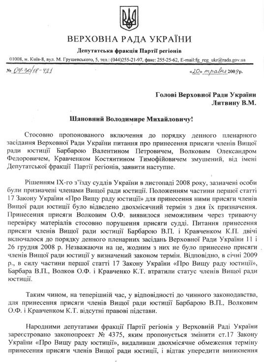 С середины января 2009 года назначенные съездом судей члены Высшего совета юстиции (ВСЮ) Барбара, Волков, Кравченко утратили статус членов Высшего совета юстиции. И на сегодняшний день не имеют правовых оснований принимать присягу членов ВСЮ.
