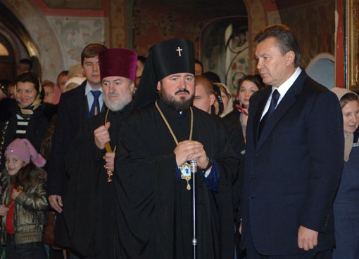 Рабочая поездка Виктора Януковича началась с посещения Председателем Партии регионов Свято-Покровского мужского монастыря – резиденции митрополита Харьковского и Богодуховского, где В.Янукович встретился с Митрополитом Никодимом.