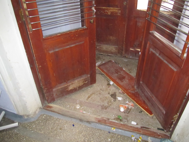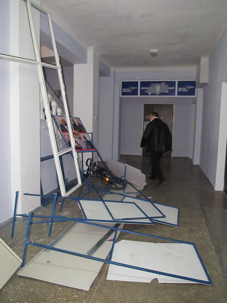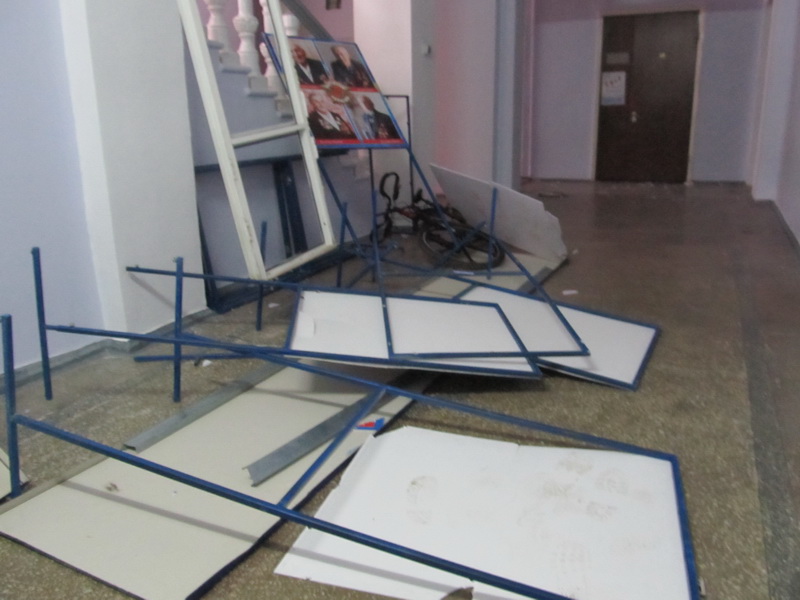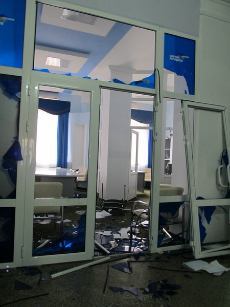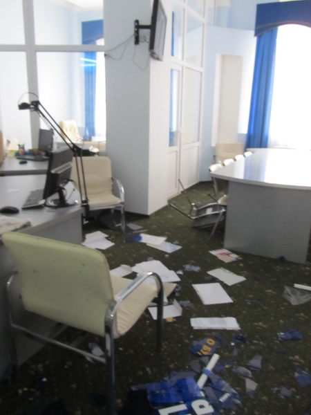 Агрессивные молодчики снесли табличку с названием организации, выбили входные двери, разбили помещение общественной приемной, перевернули там мебель и разбросали документы. Они демонстративно изуродовали партийный флаг и перевернули государственный флаг.