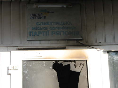 30 травня 2008 року, близько 4 години ранку скоєно напад на офіс Славутицької міської організації Партії регіонів. Невідомі розбили скло в будинку, де розміщується міськком, і жбурнули у приміщення пляшку з легкозаймистою сумішшю. Ще одну пляшку було розбито і підпалено на сходах будинку.
