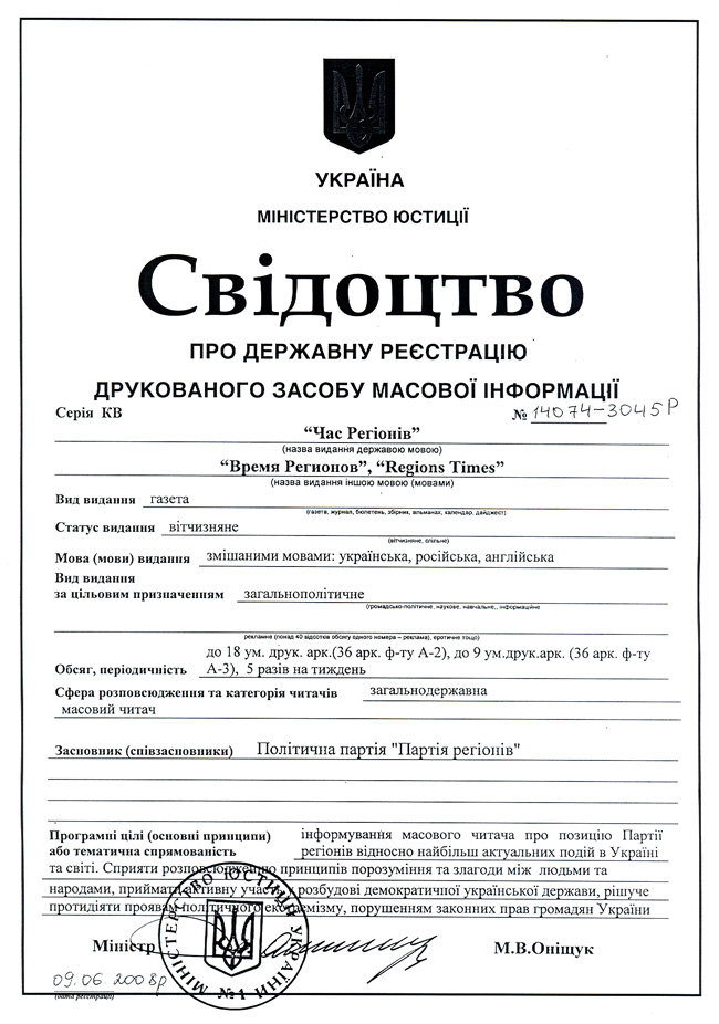 На днях Министерство юстиции выдало свидетельство о регистрации газеты «Время регионов», основателем которой является Партия регионов. Об этом сообщает DailyUA.