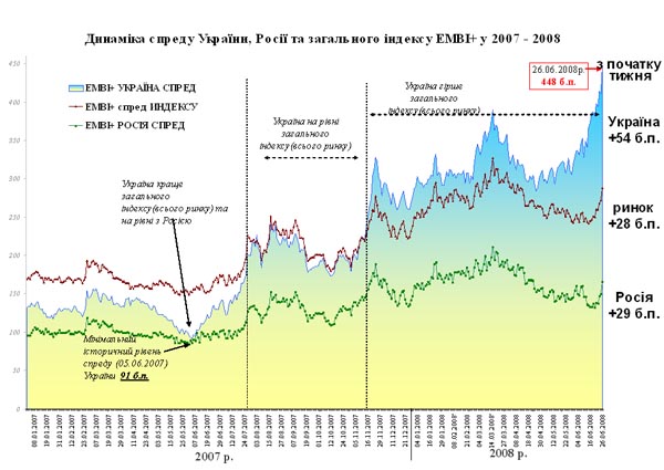 С начала года на 26 июня 2008 г. спред (плата за риск) Украины в индексе EMBI+ расширился на 175 б.п. и достиг новых «уникальных» за последние годы 448 базисных пунктов или +4% к доходности облигаций Казначейства США и стал значительно хуже, чем в большинстве развивающихся стран.