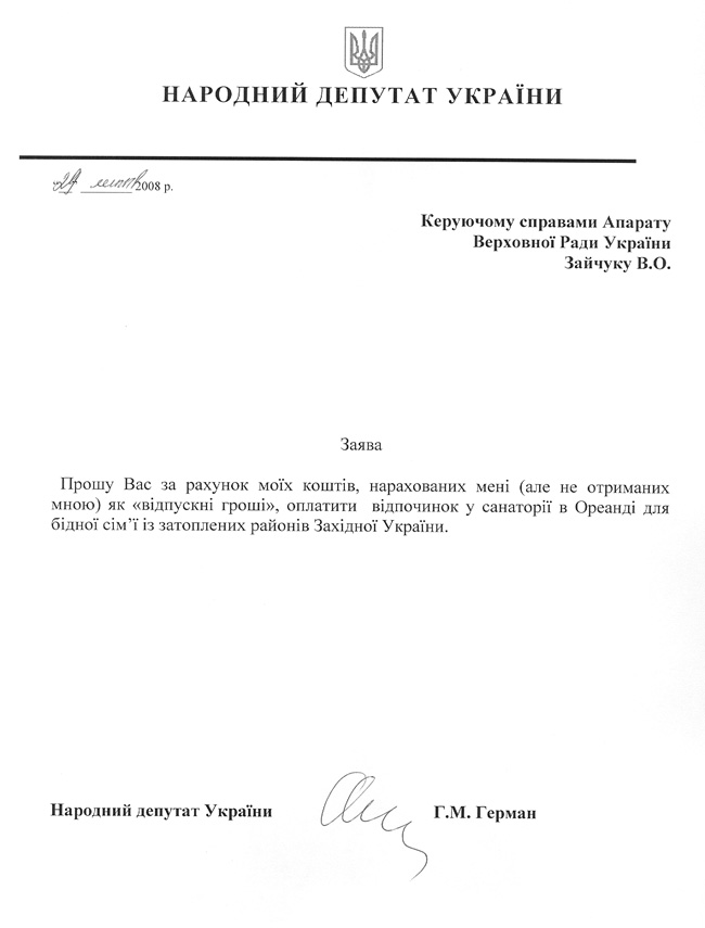 Народний депутат, заступник голови парламентської фракції Партії регіонів Ганна Герман за рахунок власних відпускних грошей оплатила літній відпочинок для бідної родини із затоплених повінню областей Західної України.