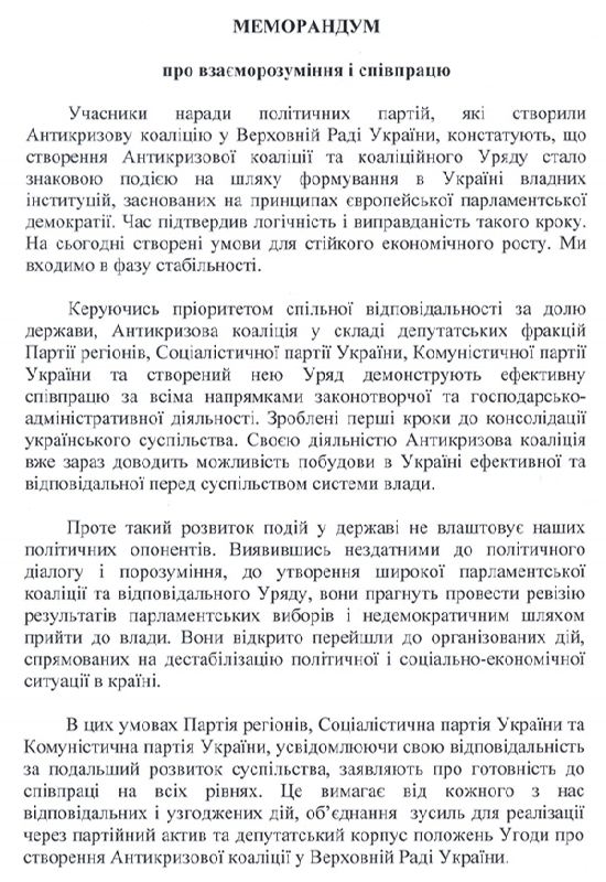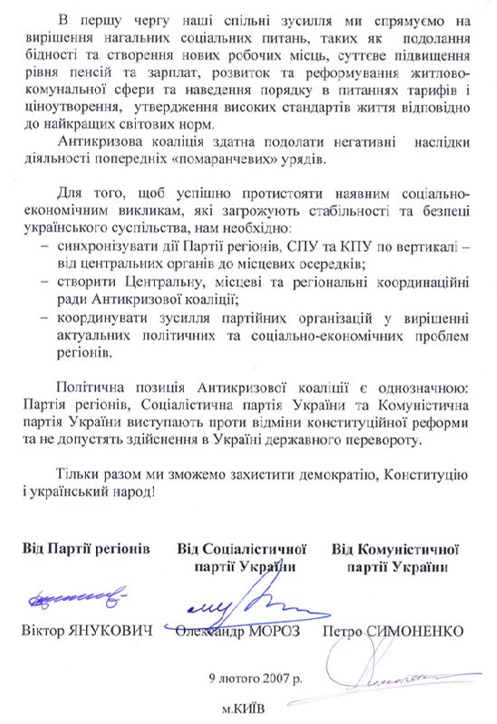 Як повідомляла раніше пресс-служба Партії регіонів, 9 лютого у кіноцентрі „Зоряний” відбулася нарада лідерів політичних партій, які утворили Антикризову коаліцію у Верховній Раді України: Партії регіонів, Соціалістичної партії України, Комуністичної партії України.
