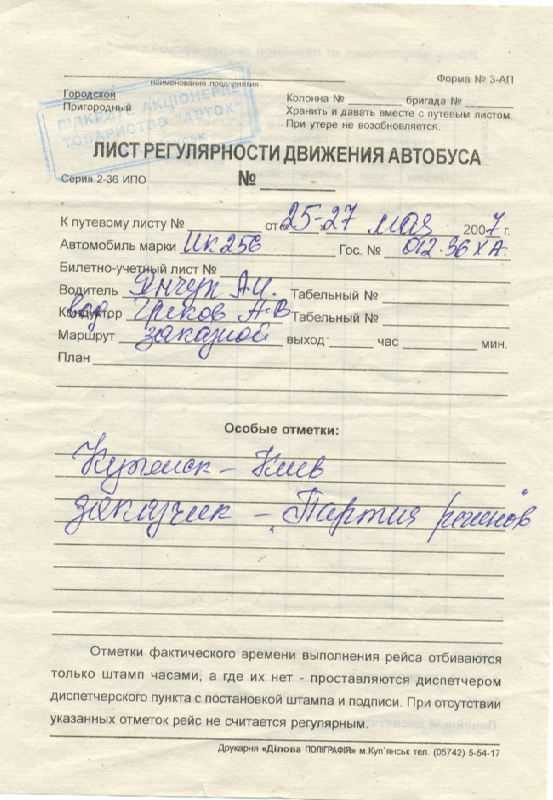 Как сообщалось ранее, с целью организации провокации в путевых листах автобусов, которые сегодня ночью должны были выехать в Киев из Харькова с территории воинской части, заказчиком была записана Партия регионов. Копия путевого листа одного из автобусов прилагается.