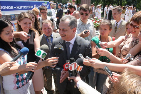 После возложения цветов к памятнику А.С.Пушкину состоялась торжественная церемония вручения от имени Партии регионов книжной продукции жителям Донецкой области, а также подарочных наборов – лучшим преподавателям русского языка, победителям олимпиад по русскому языку, военному лицею г. Донецка.