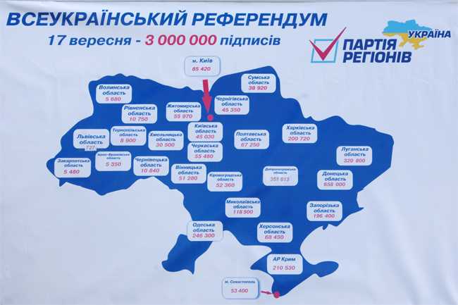 Сьогодні до Центрального виборчого штабу Партії регіонів нарешті надійшли з усіх областей, районів, найвіддаленіших великих і малих населених пунктів держави підписи громадян України на підтримку ініційованого регіоналами всенародного референдуму, зібрані станом на ранок 17 вересня. Після їх ретельного обрахування та перевірки і було підтверджено, що загальна кількість підписів упритул наблизилася до трьох мільйонів.