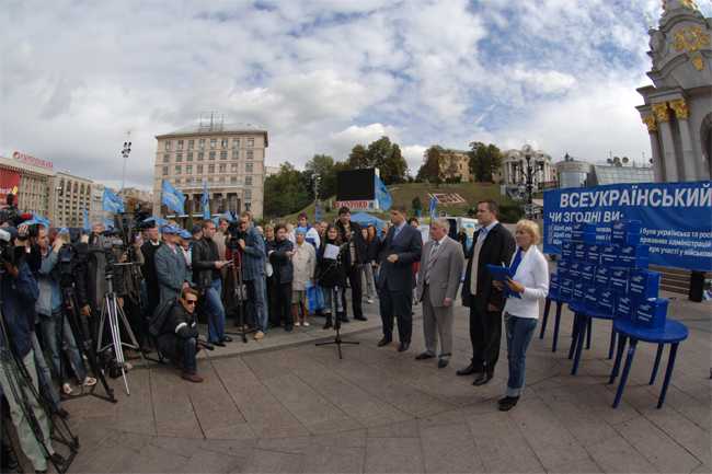 - Шановні друзі! Сьогодні пройшло лише десять днів від того моменту, як ми зустрілися разом із вами тут, на цьому Майдані, на тому місці, де зароджувалася українська демократія, на тому місці, де проходили колись заходи молодих студентів київських вузів, які боролися за незалежність, які говорили, що необхідно, аби Україна була достойною, першою серед рівних країн, які є розвинутими в демократичному світі. І ми зовсім не випадково саме тут почали збір підписів за проведення всеукраїнського референдуму.