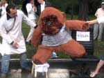 Санітари в білих халатах намагалися всадовити Горілку у крісло влади та на стільчик опозиції. Проте мавпа завалювалася то в один, то в інший бік, або зовсім падала долівки.