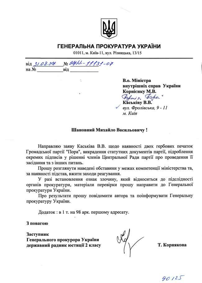 Генеральнапрокуратура України звернулася до Міністерства внутрішніх справ України зпроханням розглянути заяву Владислава Каськіва щодо наявності двох гербовихпечаток Громадянської партії «ПОРА», викрадення статутних документів партії,підроблення окремих підписів у рішенні членів Центральної Ради партії пропроведення її засідання тощо.