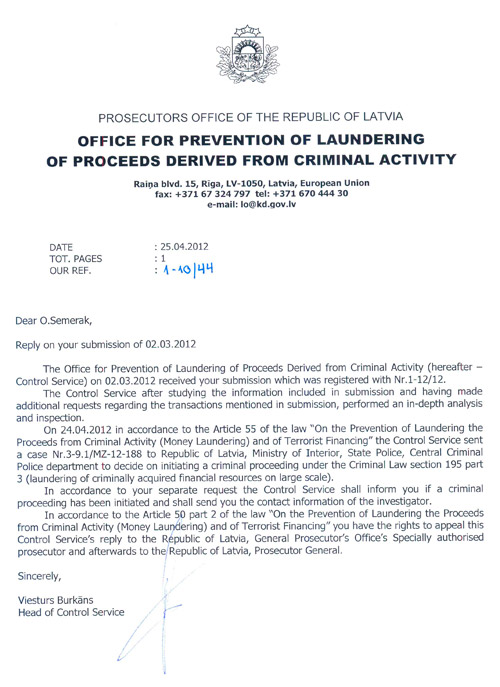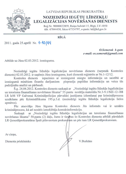 Розслідування було ініційоване Генеральною прокуратурою Латвії після звернення Остапа Семерака. У листі до нього Генпрокуратура повідомила про передачу даної справи до Міністерства внутрішніх справ, Державної поліції, Центральної кримінальної поліції для «порушення кримінальної справи за фактом відмивання отриманих злочинним шляхом коштів у великих розмірах».