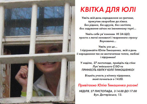 Партія «Реформи і Порядок» закликає всіх небайдужих узяти участь в акції «Квітка для Юлі», яка проводитиметься біля Київського (Лук’янівського) СІЗО (вул. Дегтярівська, 13) 27 листопада – у день народження Юлії Тимошенко.