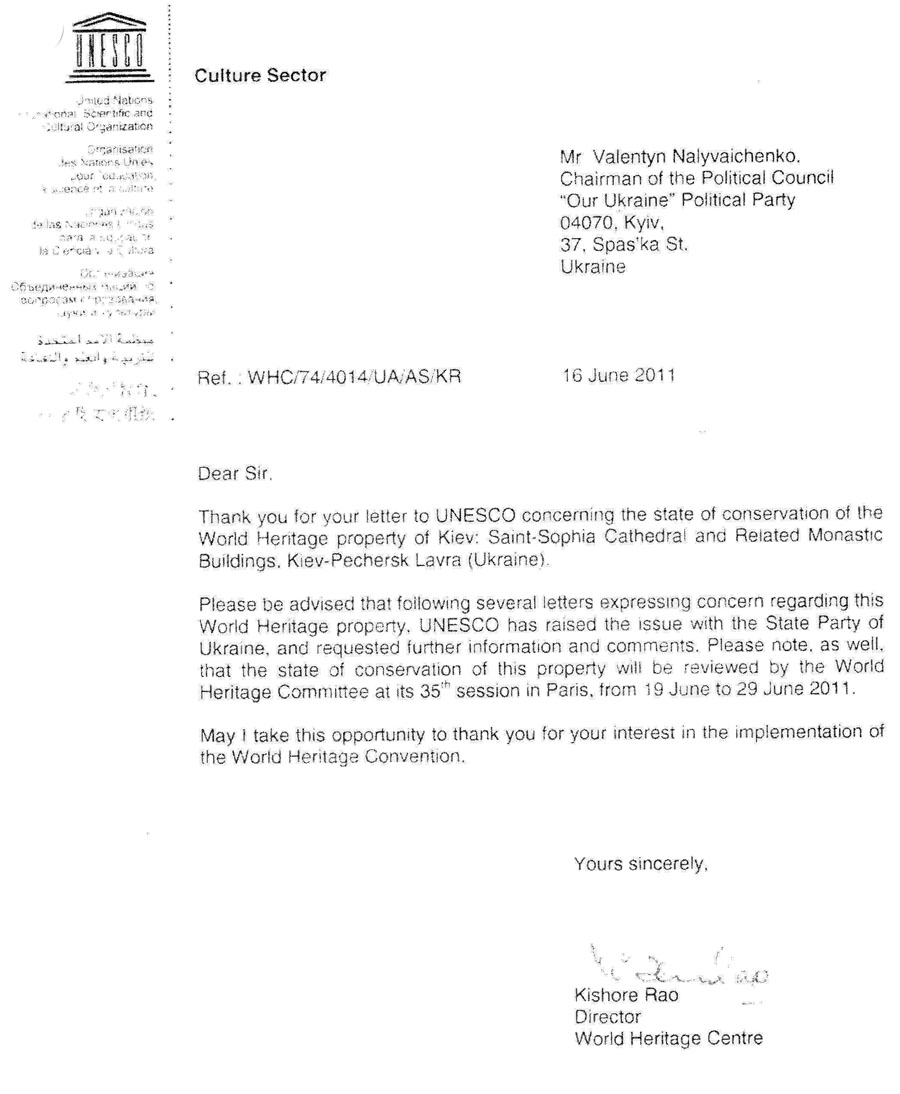 У ЮНЕСКО поділяють стурбованість долею цієї пам’ятки і інформують Наливайченка, що ця стурбованість доведена до української влади. Пропонуємо Вашій увазі оригінал листа.