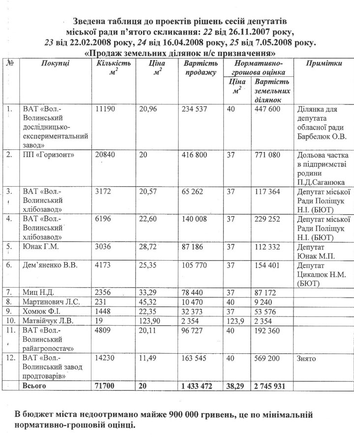 «В результаті подібних дій, за оцінками місцевих експертів, бюджет міста Володимир-Волинський недоотримав майже 900 тис. грн. Важко визначити подібні дії інакше, ніж розбазарювання землі із зловживанням службовим становищем», - переконаний «нашоукраїнець».