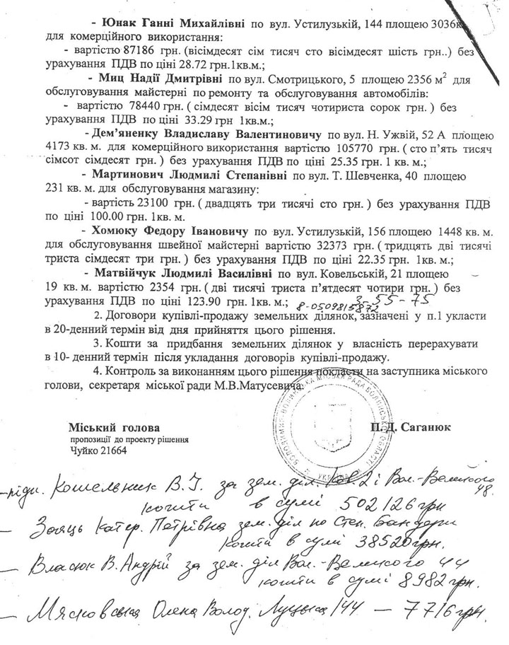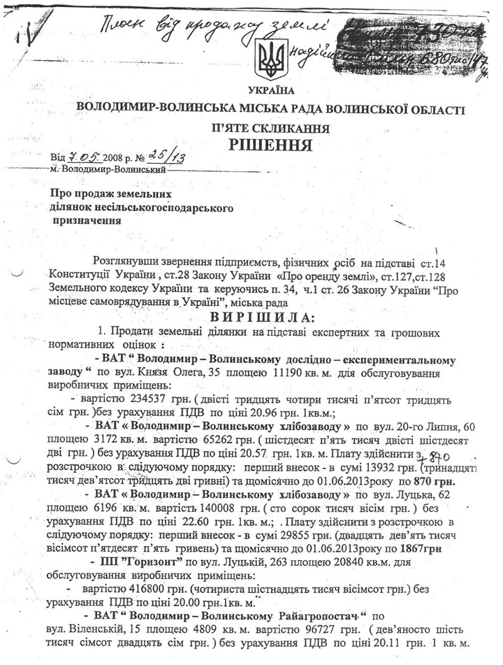 На підтвердження своїх слів він навів той факт, що 7 травня 2008 р. депутати міської ради за активного спонукання міського голови проголосували за рішення №25/13 «Про продаж земельних ділянок несільськогосподарського призначення». Цим рішенням низці підприємств і фізичних осіб було виділено понад 5,7 га землі, оцінених за вкрай невигідною для міського бюджету методикою.