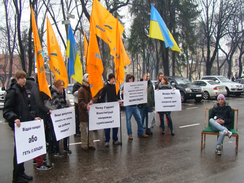У Львові під стінами обласної державної адміністрації активісти «Нашої України» провели флеш-моб «Віддай мандат, або геть із посади!» з вимогою припинити діяльність депутатів Верховної Ради, які незаконно суміщають цю посаду з роботою в органах виконавчої влади. Голові ОДА, який є одним із сумісників, вручили два стільці, скріплені між собою скотчем, що символізує його намагання всидіти одночасно на двох посадах.