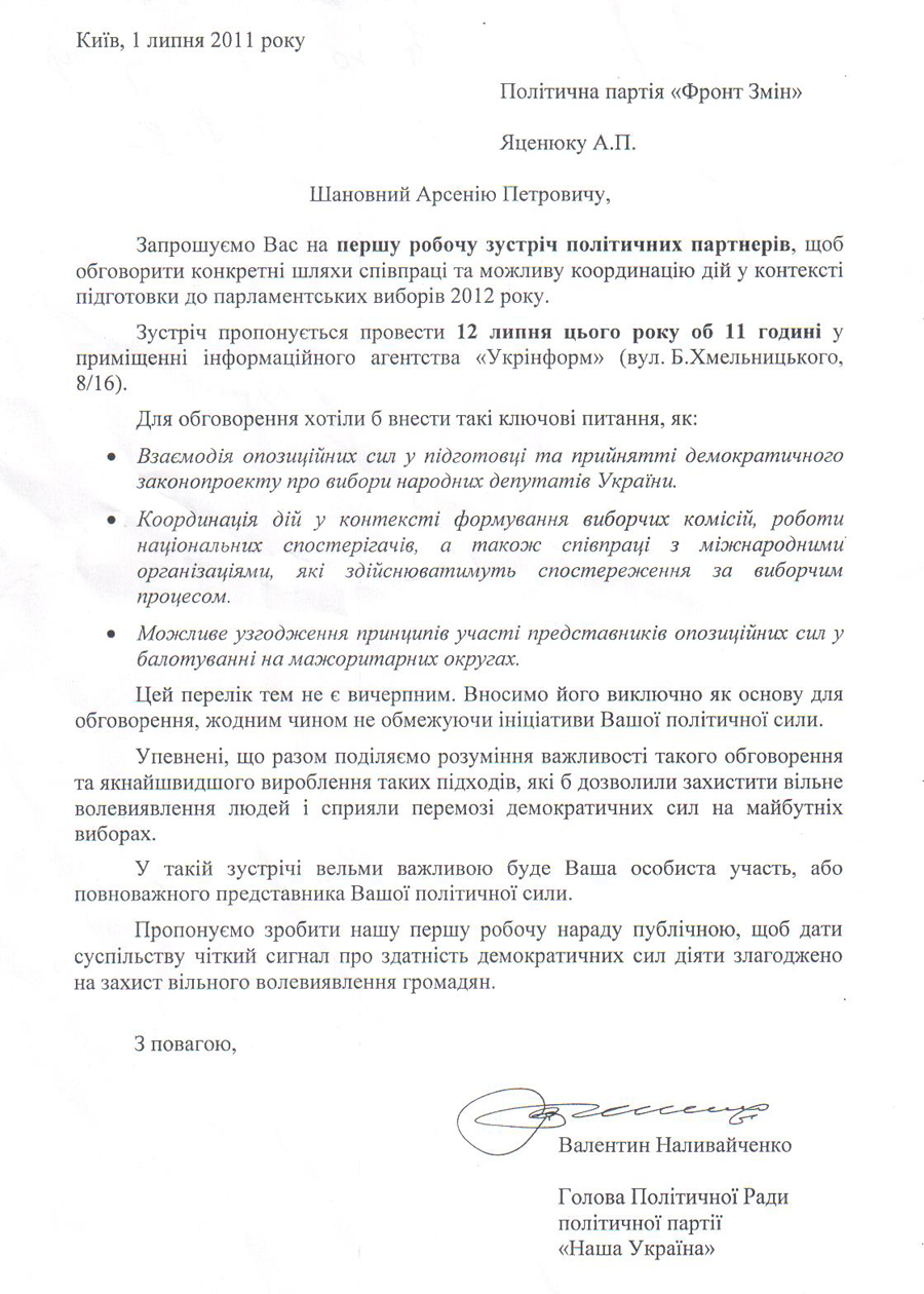 «Наша Україна» спростовує заяву представника партії «Фронт Змін» Андрія Пишного про те, що його політичну силу не було запрошено на зустріч опозиційних сил 12 липня. «Наша Україна» надіслала запрошення на робочу зустріч політичних партнерів для захисту чесних виборів сімнадцяти політичним партіям, в числі яких і «Фронт змін». Запрошення на ім’я лідера партії було доправлене кур’єром 1 липня 2011 року і прийняте секретарем, про що на копії запрошення зроблена відповідна відмітка.