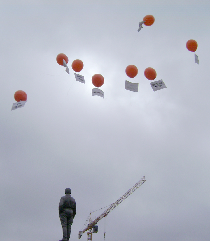 Учасники акції запустили в повітря десятки кульок з написами «Ціни злітають до небес!», «Подяка нашому Уряду за зліт цін!», «Ціна гречки», «Ціна борошна», «Ціна бензину», «Комунальні тарифи», «Ціна овочів», «Ціна проїзду», «Ціна освіти», «Аптечні ціни».