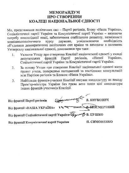Пресс-служба “Нашей Украины” делает достоянием гласности Меморандум о создании Коалиции национального единства, подписанный 3 августа, в ночь подписания Универсала национального единства. Меморандум был подписан тремя политическими силами – от “Нашей Украины” его подписал Роман Безсмертный, он Партии регионов – Виктор Янукович, а от социалистов – Василий Цушко. Подписи представителей коммунистов под Меморандумом нет. Приводим оригинал документа.