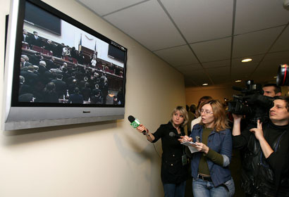 Журналистов в зал не пускают, поэтому они отслеживают ход событий с помощью экранов в холле. Смотрите наш фоторепортаж.