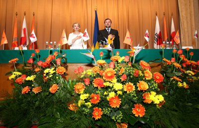 Во время церемонии на сцену выходили по три представителя от БЮТ и “Нашей Украины” – руководитель областной партийной организации, руководители фракций в облсовете и горсовете - и подписывали документ.
