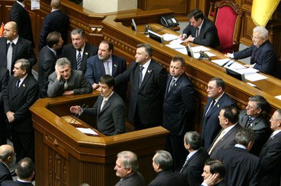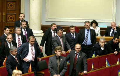 Сегодня парламент продолжил свою работу в режиме пленарных заседаний. Ключевым событием стало решение представителей объединенной оппозиции уйти из сессионного зала Верховной Рады и не принимать участия в пленарных заседаниях. Они это сделали в знак протеста против того, что “антикризовики” не приняли требований объединенной оппозиции. Как известно, вчера лидеры “Нашей Украины” и БЮТ Вячеслав Кириленко и Юлия Тимошенко подписали заявление о совместных действиях и требованиях к "антикризовикам”. Смотрите наш фоторепортаж.