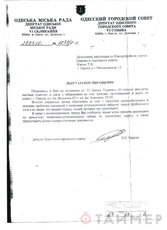 Благодаря вмешательству Игоря Маркова незаконные строительные работы на футбольном поле в одном из дворов Таирова будут прекращены, а самовольно воздвигнутый забор - демонтирован.