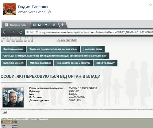 Об этом свидетельствуют записи, опубликованные в социальных сетях самими «родинцами»: члены партии публикуют на своих страницах скрин-шоты объявлений о розыске с сайта ГУ МВД Украины в Одесской области.