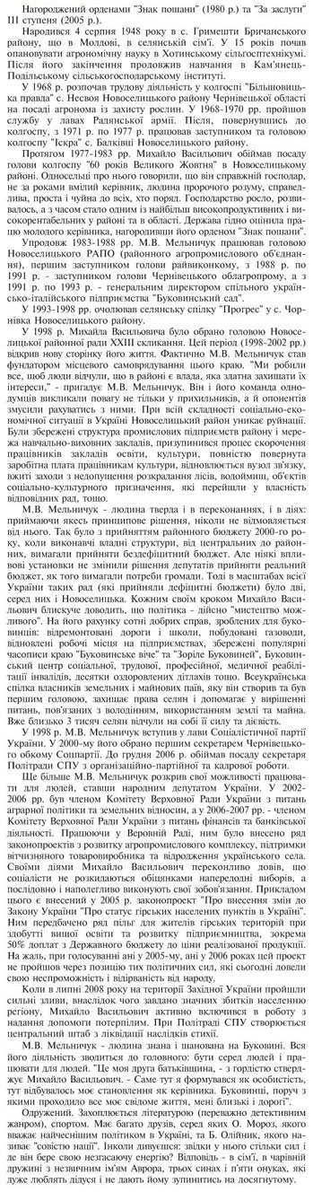 Михаил Васильевич Мельничук родился 4 августа 1948 года в молдавском селе Гримешты. Судьбой ему был уготован непростой и ответственный жизненный путь - от колхозного агронома до главы парламентской фракции одной из ведущих политических партий Украины. Однако кем бы ни трудился М.Мельничук - председателем колхоза в родном Новоселицком районе Черновецкой области, председателем районного агропромышленного объединения, крестьянского союза, председателем Новоселицкого райсовета, депутатом украинского парламента - его душа, его сердце всегда болели о судьбе простого крестьянина, сельского труженика.