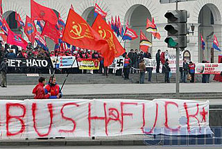 Крім того, уздовж вулиці Інститутської учасники акції вивісили білий транспарант, на якому червоними латинськими буквами написані різні вислови англійською мовою на адресу Президента США Джорджа Буша і НАТО. Поки що лідери партій перед мітингувальниками не виступали, виступи очікуються після 13:30.