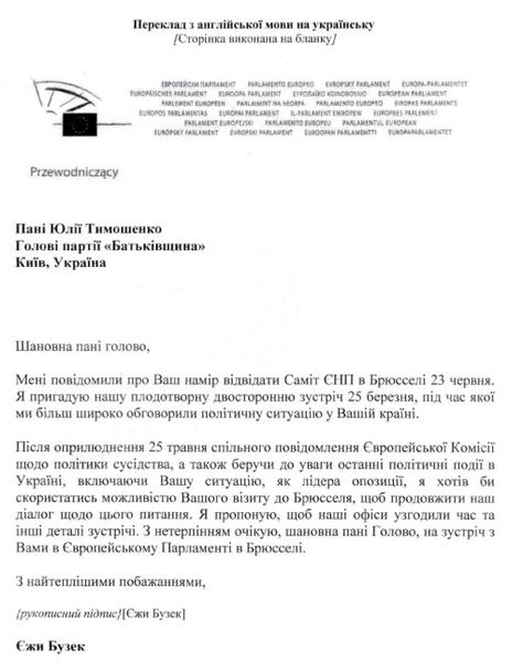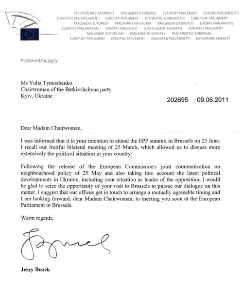 Президент Европарламента Ежи Бузек пригласил Юлию Тимошенко в Брюссель. Ежи Бузек предлагает лидеру партии "Батьківщина" встретиться 23 июня, во время работы Саммита Европейской народной партии. Президент Европарламента планирует обсудить с Юлией Тимошенко последние политические события в Украине. В своем письме Ежи Бузек отмечает: "После обнародования 25 мая совместного сообщения Европейской Комиссии относительно политики соседства, а также учитывая последние политические события в Украине, включая Вашу ситуацию как лидера оппозиции, я хотел бы воспользоваться возможностью Вашего визита в Брюссель, чтобы продолжить диалог по этому вопросу". Особую актуальность встречу с Президентом Европарламента приобретает после принятия резолюции с призывом к украинским властям о прекращении политических репрессий против Юлии Тимошенко и отмене ей подписки о невыезде. Европейский парламент призывает власти не ограничивать с помощью уголовного преследования политическую деятельность и поездки лидера оппозиции. Ходатайство о поездке в Брюссель для встречи с президентом Европарламента Ежи Бузеком Юлия Тимошенко передала в Генеральную прокуратуру 15 июня. Кроме того, 14 июня в Генпрокуратуру было передано ходатайство о поездке Юлии Тимошенко 21-22 июня в Страсбург. Согласно законодательству, ГПУ должна дать ответ в течение трех дней.