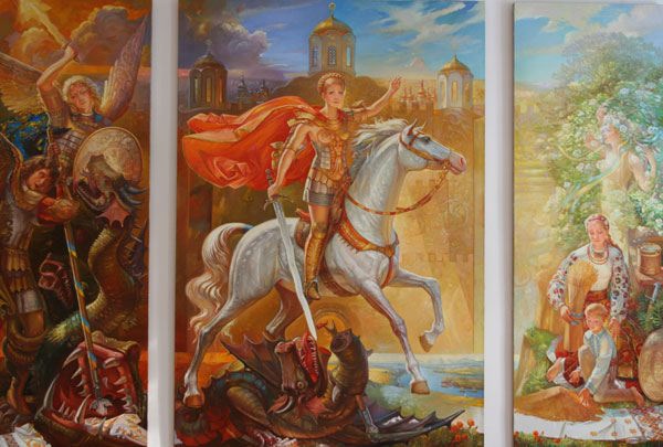 Проект презентует несколько изображений Георгия-Победоносца. На одной из хорошо известных композиций, на которой Георгий-Победоносец убивает змея, в образе покровителя воинства и победителя зла, которым в иконографии и христианской традиции является этот сакральный герой, легко угадывается Юлия Тимошенко.