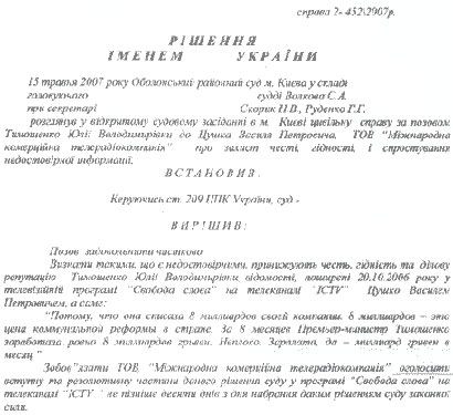 Об этом говорится в соответствующем решении Оболонского районного суда Киева от 15 мая 2007 г.