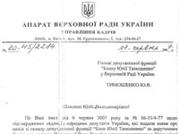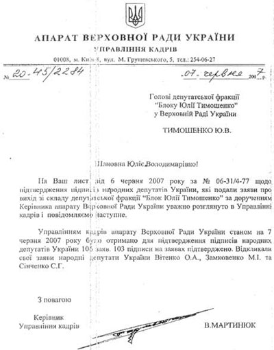 "Управлением кадров аппарата Верховной Рады Украины по состоянию на 7 июня 2007 года было получено для подтверждения подписей народных депутатов Украины 106 заявлений. 103 подписи на заявлениях подтверждены", - сказано в письме.