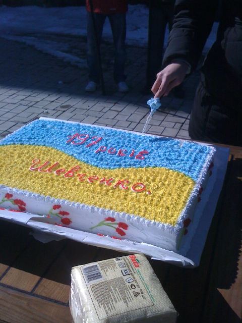 Сегодня в 12:00 возле Донецкого городского совета активисты молодежных общественных организаций провели флеш-моб, посвященный 197-летию со Дня рождения украинского поэта Тараса Шевченко. Они презентовали праздничный торт в виде Государственного флага, украшенного ниспадающей ветвью калины. Этим тортом активисты собирались угостить чиновников горсовета в обмен на цитирование произведений Шевченко.